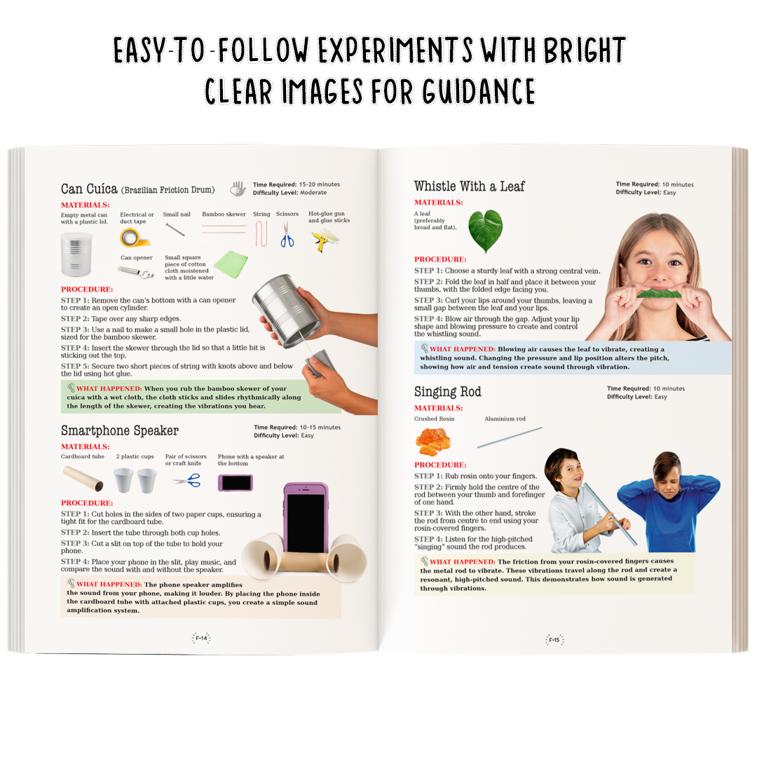 - Explore Every Branch of Science: Includes experiments on sound, light, gravity, force, heat, pressure, magnetism, and chemical reactions.